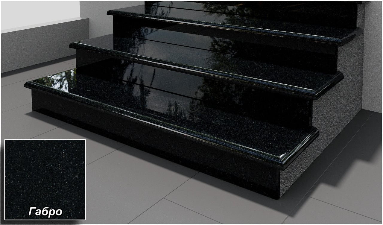 Гранітні сходинки чорного або темно-сірого кольору. Наше підприємство, яке знаходиться в Житомирській області, виготовляє сходинки по вашим індивідуальним розмірам. Сходинки можуть бути як поліровані(як правило всередені приміщень), так і термооброблені - для використання на вулиці. Зазвичай сходинки робляться товщиною 3 см. Але по бажанню замовників ми можемо зробити їх любої товщини. Ми організуємо доставку сходинок по всій Україні попутним транспортом або Новою поштою.