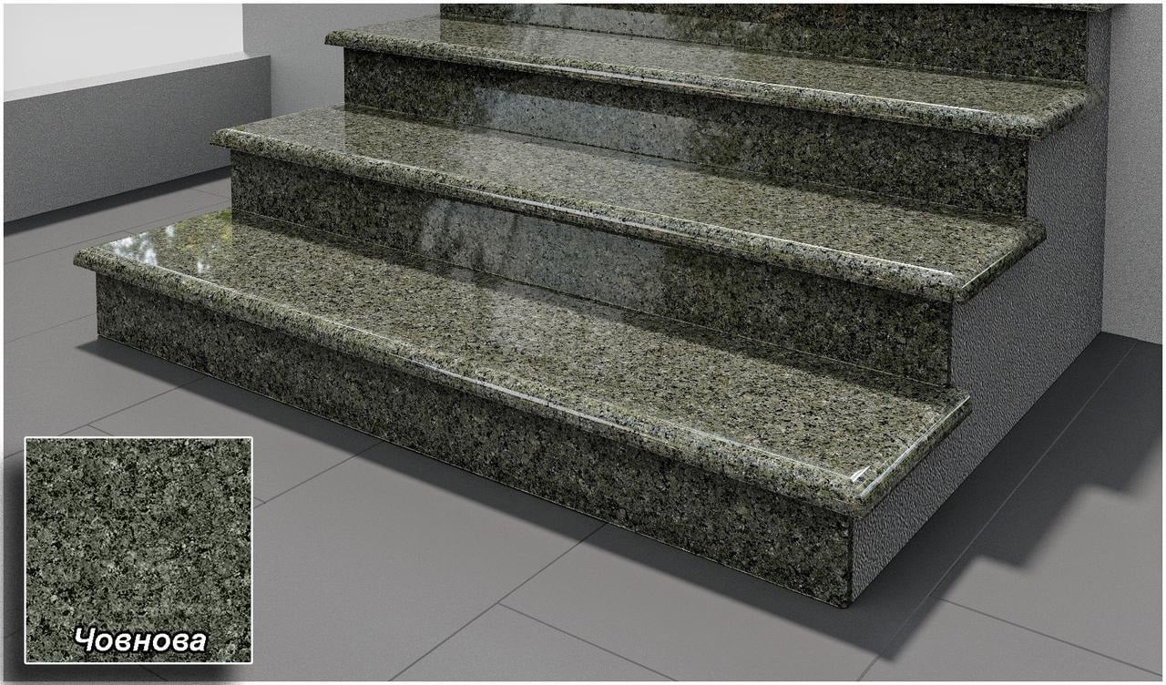 Гранітні сходинки зеленого кольору. Наше підприємство, яке знаходиться в Житомирській області, виготовляє сходинки по вашим індивідуальним розмірам. Сходинки можуть бути як поліровані(як правило всередені приміщень), так і термооброблені - для використання на вулиці. Зазвичай сходинки робляться товщиною 3 см. Але по бажанню замовників ми можемо зробити їх любої товщини. Ми організуємо доставку сходинок по всій Україні попутним транспортом або Новою поштою.