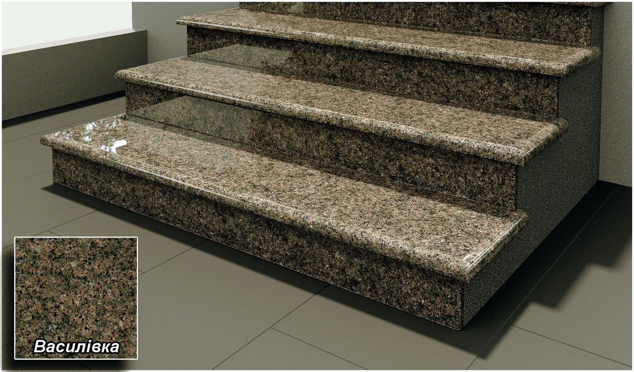Гранітні сходинки зелено-коричневого кольору. Наше підприємство, яке знаходиться в Житомирській області, виготовляє сходинки по вашим індивідуальним розмірам. Сходинки можуть бути як поліровані(як правило всередені приміщень), так і термооброблені - для використання на вулиці. Зазвичай сходинки робляться товщиною 3 см. Але по бажанню замовників ми можемо зробити їх любої товщини. Ми організуємо доставку сходинок по всій Україні попутним транспортом або Новою поштою.