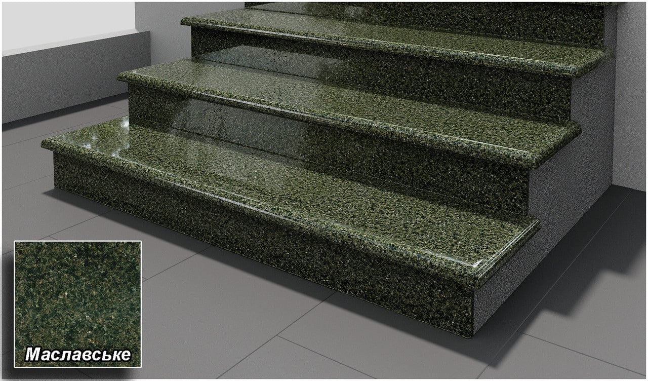 Гранітні сходинки зеленого кольору. Наше підприємство, яке знаходиться в Житомирській області, виготовляє сходинки по вашим індивідуальним розмірам. Сходинки можуть бути як поліровані(як правило всередені приміщень), так і термооброблені - для використання на вулиці. Зазвичай сходинки робляться товщиною 3 см. Але по бажанню замовників ми можемо зробити їх любої товщини. Ми організуємо доставку сходинок по всій Україні попутним транспортом або Новою поштою.