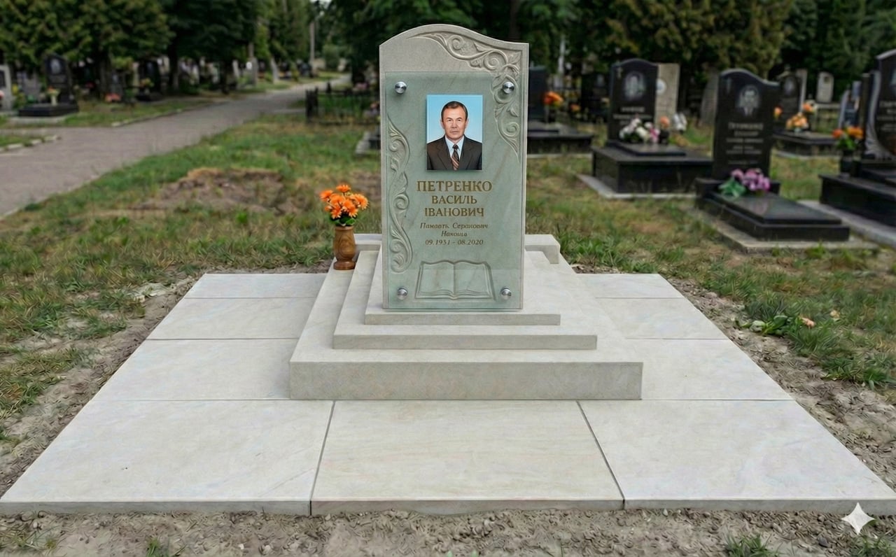 Високий багатоярусний пам'ятник. Висота 175 см. Виготовлений із натурального каменю пісковику. Можливо вибрати колір піщаника від світлого, бежевого до жовтого з розводами. Великий майданчик 280*280 см. Розмір майданчика можна зробити будь-якою, з урахуванням розміру вашої ділянки.