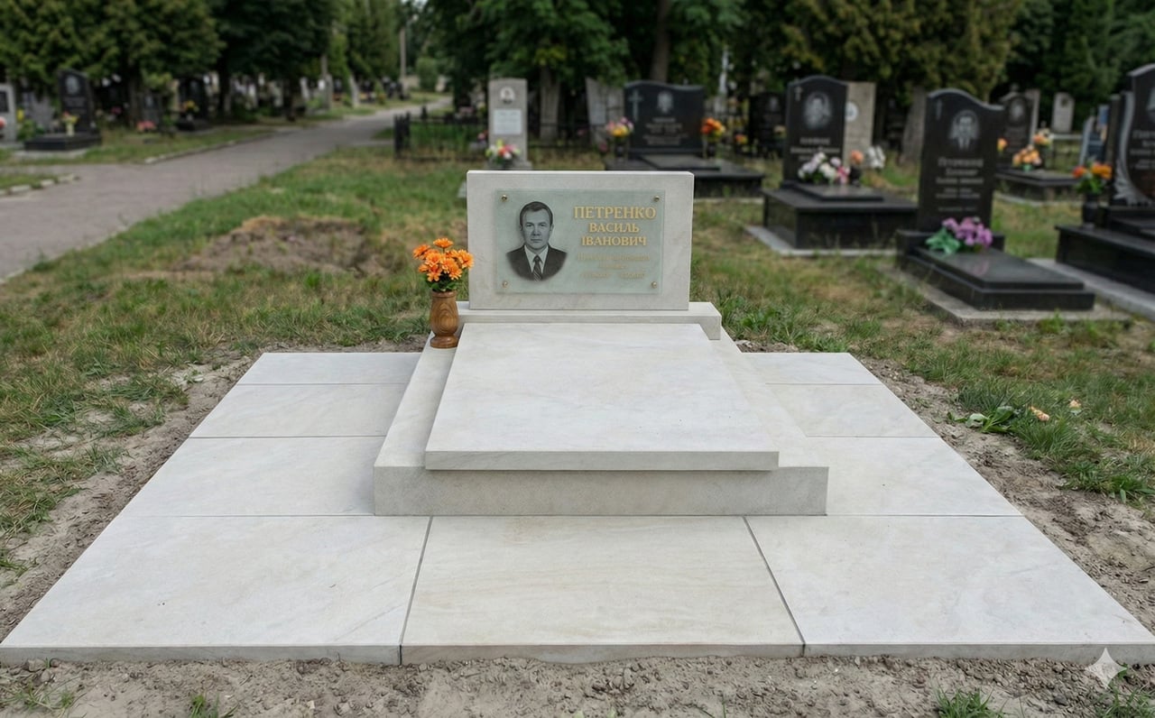 Пам'ятник із горизонтальною стелою та широкою надгробокою плитою. Виготовлений із натурального каменю пісковику. Можливо вибрати колір піщаника від світлого, бежевого до жовтого з розводами. Великий майданчик 280*280 см. Розмір майданчика можна зробити будь-якою, з урахуванням розміру вашої ділянки.
