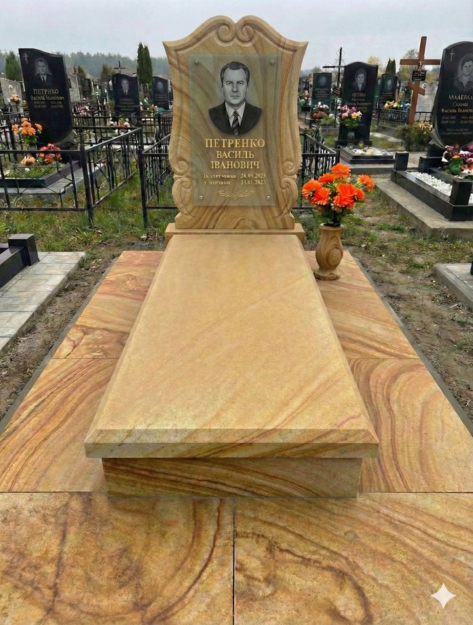 Комплект пам'ятника з надгробною плитою та відмосткою. Виготовлений із натурального каменю пісковику. Камінь може бути як світлий, так і насичено жовтим із розводами. Модель стели може бути в різних варіантах. Розмір майданчика 150*240 см. Розмір відмостки можна зробити будь-якою, з урахуванням розміру вашої ділянки.
