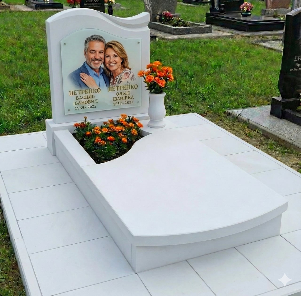 Акуратний пам'ятник для сімейної пари. Комплект із надгробною плитою з невеликим квітником і майданчиком. Виготовлений у натуральному камені пісковику, який за текстурою схожий на мармур. Доступна альтернатива дорогим пам'ятникам із імпортного мармуру. Розмір майданчика 180*230 см. Розмір відмостки можна змінювати, з урахуванням розміру вашої ділянки. Цю модель можна використовувати і як одинарний пам'ятник.