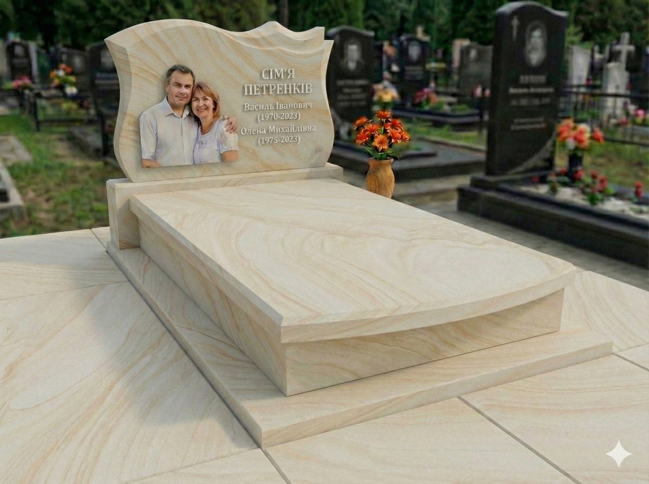 Гарний пам'ятник для сімейної пари. Комплект із широкою надгробною плитою і великим майданчиком. Виготовлений у натуральному камені пісковику, який за текстурою схожий на мармур. Доступна альтернатива дорогим пам'ятникам із імпортного мармуру. Розмір майданчика 250*250 см. Розмір відмостки можна змінювати, з урахуванням розміру вашої ділянки. Цю модель можна використовувати і як одинарний пам'ятник.