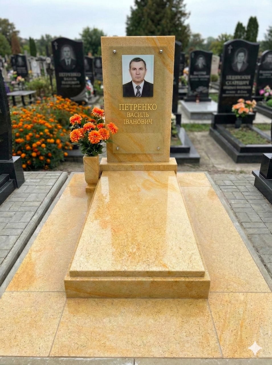 Класичний пам'ятник, виготовлений у світлому камені. Має багатий вигляд. Прекрасна альтернатива пам'ятникам у чорному кольорі. Стіну можна зробити фігурною. Розмір стели 120*60*8. Ця модель підійде і для жінки. Розмір майданчика 140х220 см. Розмір майданчика можемо зробити будь-якої, з урахуванням розміру вашої ділянки.