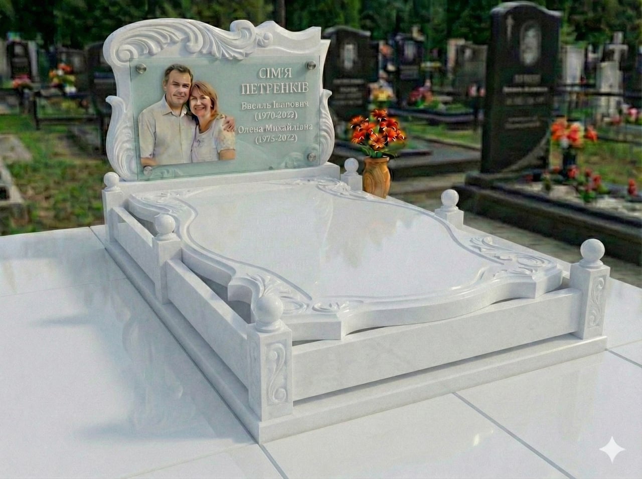 Елітний пам'ятник для сімейної пари. Комплект із широкою надгробною плитою і великим майданчиком. Виготовлений у натуральному камені пісковику, який за текстурою схожий на мармур. Доступна альтернатива дорогим пам'ятникам із імпортного мармуру. Розмір майданчика 250*250 см. Розмір відмостки можна змінювати, з урахуванням розміру вашої ділянки. Цю модель можна використовувати і як одинарний пам'ятник.