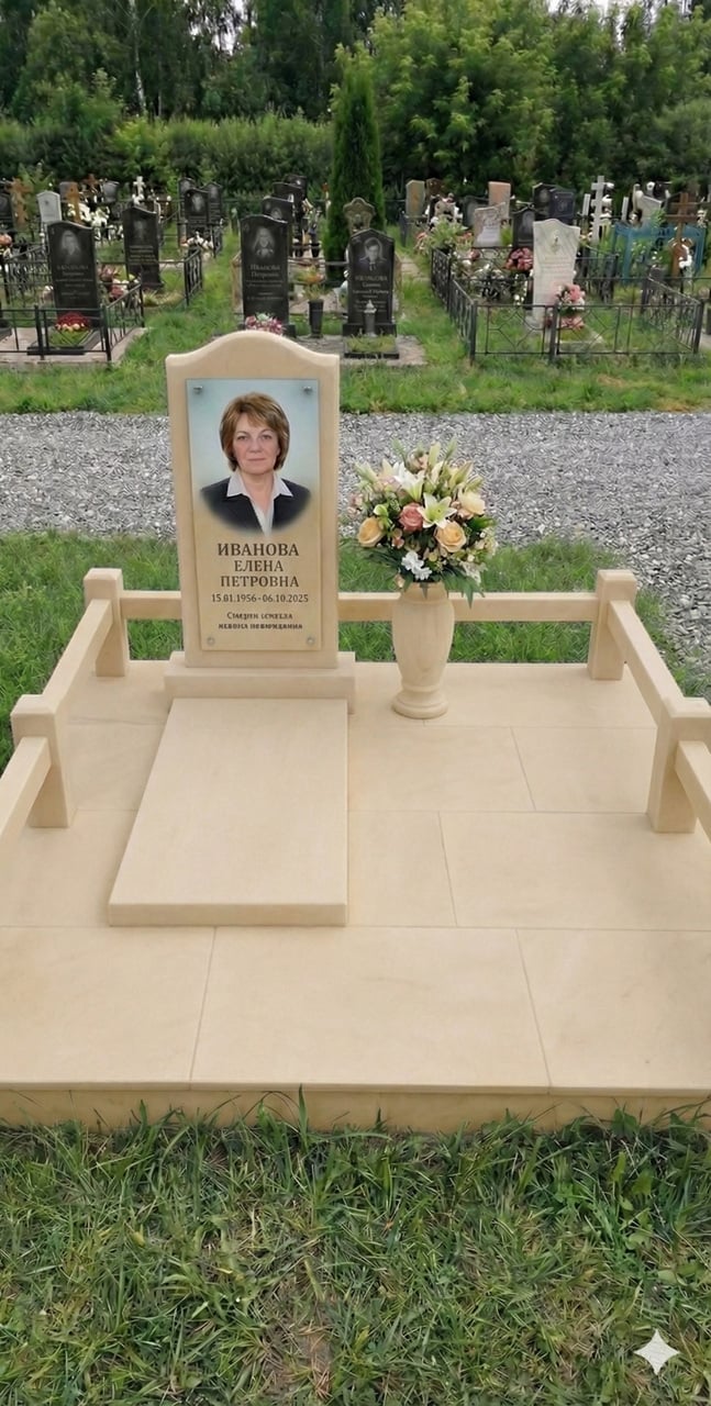 Простий, але красивий комплекс зі світлого каменю, який містить майданчик і огорожу. Камінь для пам'ятника може бути виготовлений у різних відтінках. Розмір майданчика 220*200 см. Розмір стели 120*60*8. Розмір майданчика можна змінити, з урахуванням розміру вашої ділянки.