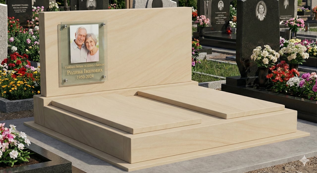 Великий майданчик 200*170. Розмір стелі 160 х 80 х 8. Виготовлений із натурального каменю пісковику. Колір каменю може бути від білого до жовтого з розводами. Розмір майданчика та форму стели можна змінити за вашими побажаннями та з урахуванням розміру вашої ділянки.