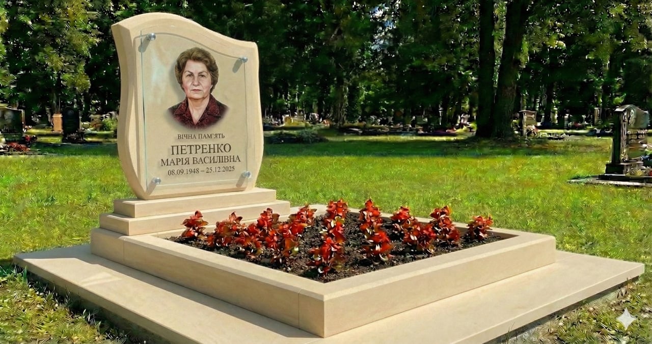 Гарний пам'ятник із натурального каменю піщаника з горизонтальною стелею та великим квітником. Розмір стелі 120 х 80 х 8. Пам'ятник комплектується відмосткою з плит такого ж каменю. Розмір майданчика 220*220 см. Розмір відмостки можна зробити будь-якою, з урахуванням розміру вашої ділянки. Також можемо внести зміни в дизайн пам'ятника, згідно з вашими побажаннями.