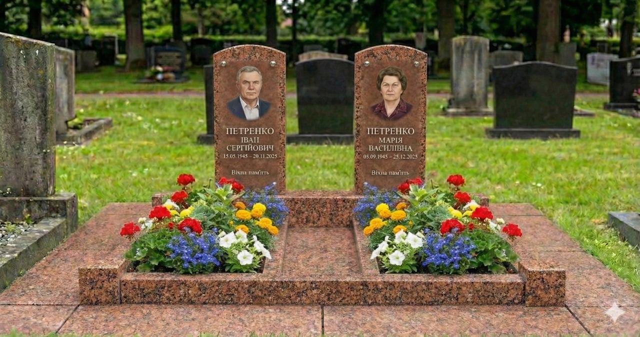 Опис Подвійний пам'ятник із червоного граніту з майданчиком