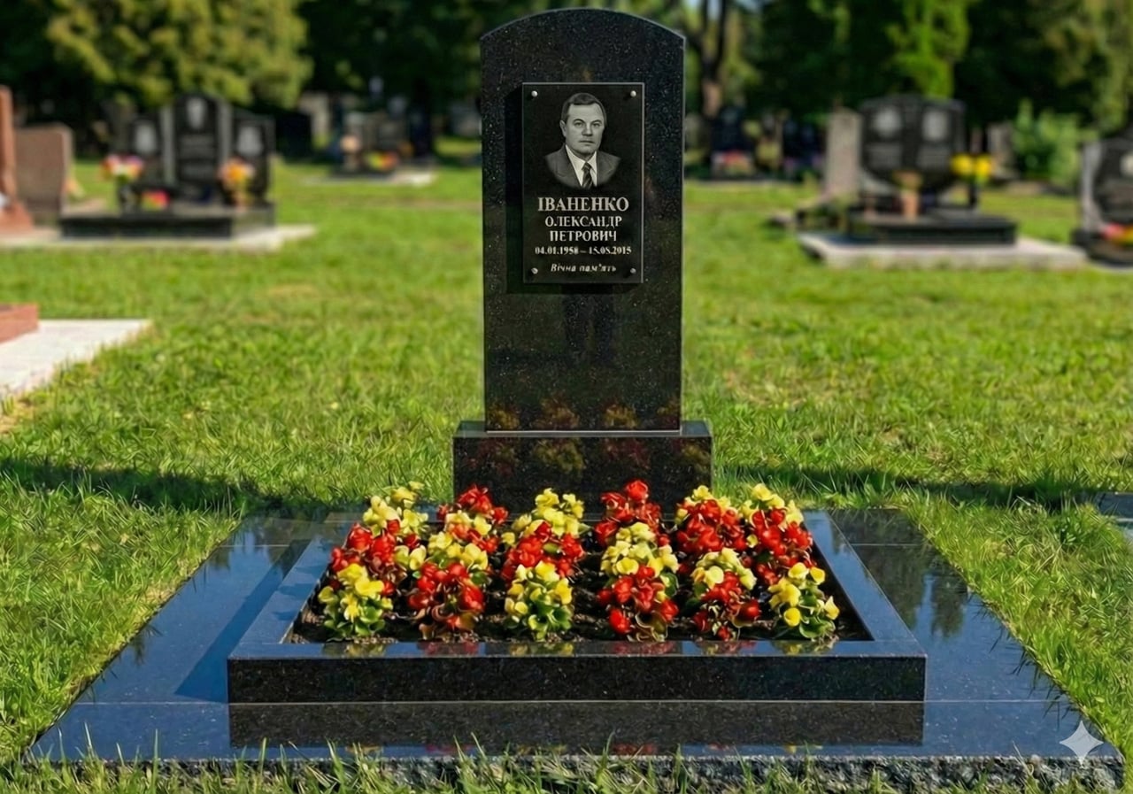 Опис Пам'ятник із великим квітником і відмосткою чорний граніт