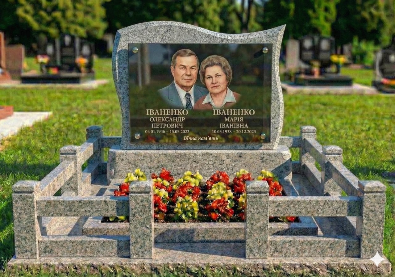 Комплекс із горизонтальною слотою розміром 120*80*8. Розмір майданчика 220*180 см. Можливе виготовлення в декількох колірних варіантах сірого граніту, а також у червоному, зеленому та чорному гранітах. Може бути як із надгробною плитою, так і з квітником. На ціну також впливає форма стели: пряма або фігурна. Можна змінити розмір комплексу або його дизайн, з урахуванням ваших уподобань. Цю модель можна використовувати і як пам'ятник для одного.