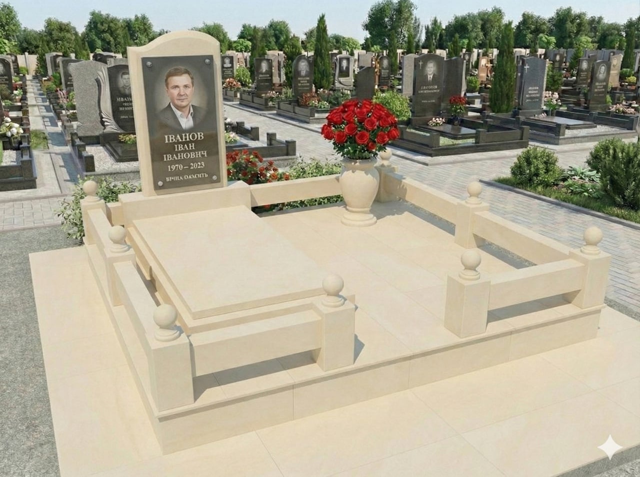 Розмір комплексу 260*240 см. Висота 180 см. Комплектується відмісткою завширшки 60 см із передньої частини пам'ятника та по 30 см із боків. Розміри меморіалу з відстібкою становлять 300х320 см. Розмір комплексу та дизайн можна змінити з урахуванням ваших побажань. Пропонуємо послуги дизайнера, з можливістю 3д візуалізації. Комплекс може бути виготовлений із червоного, чорного, сірого, зеленого гранітів і їх комбінацій, а також зі світлого піщаника.