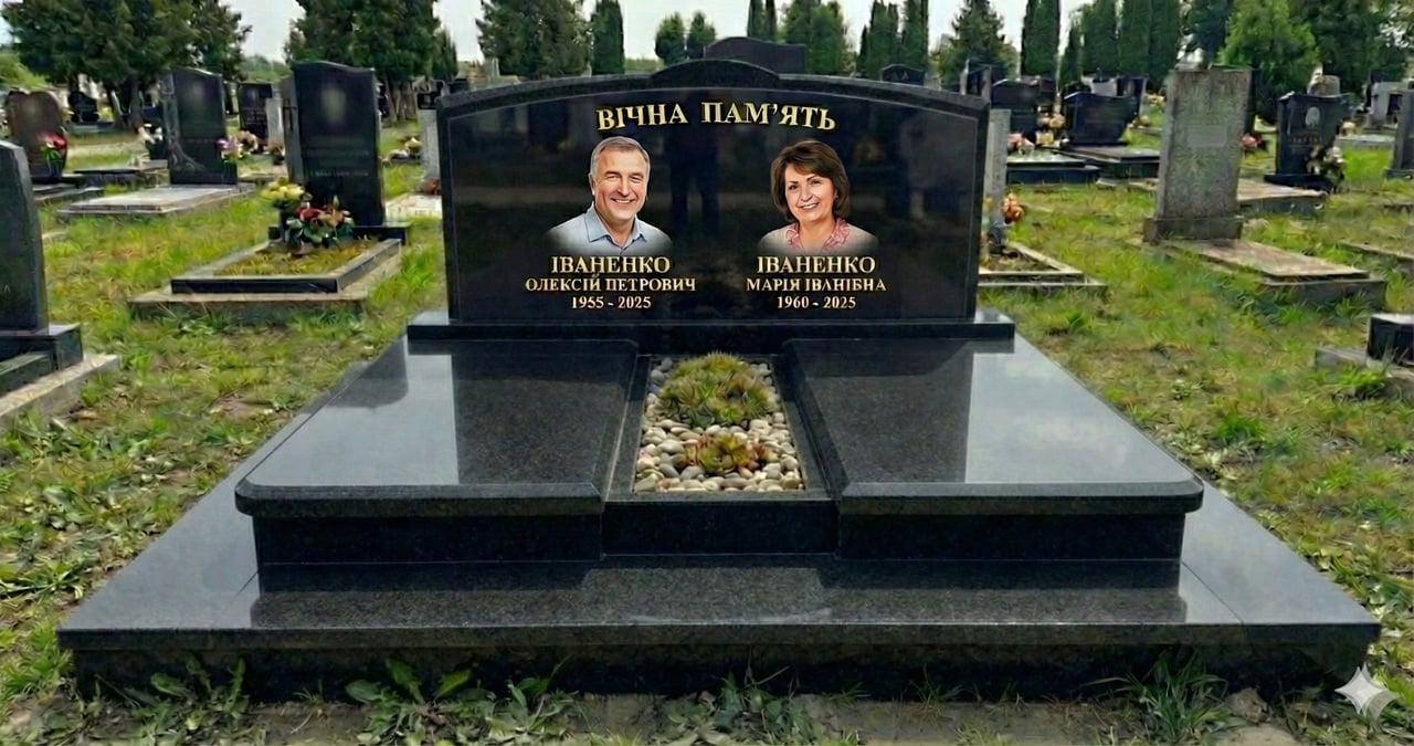 Велика фігурна стела 160*80*8. Пам'ятник комплектується двома надгробними плитами та квітником між ними, і майданчиком. Розмір майданчика (комплексу) 260*200 см. Може бути виготовлений із чорного, червоного, зеленого або сірого граніту, а також білого або жовтого піщаника. Розмір пам'ятника та дизайн можемо змінити, з урахуванням ваших побажань.