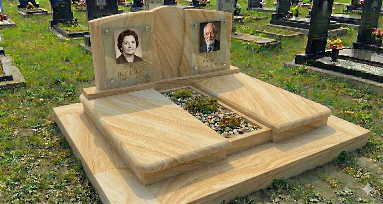 Подвійний пам'ятник із горизонтальною стелою та майданчиком жовтий камінь