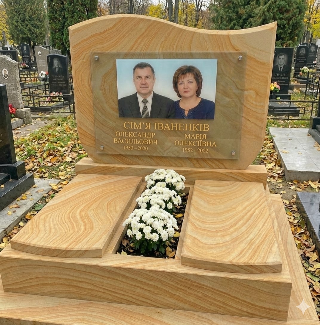 Подвійний пам'ятник із горизонтальною стелою й відмосткою жовтий камінь