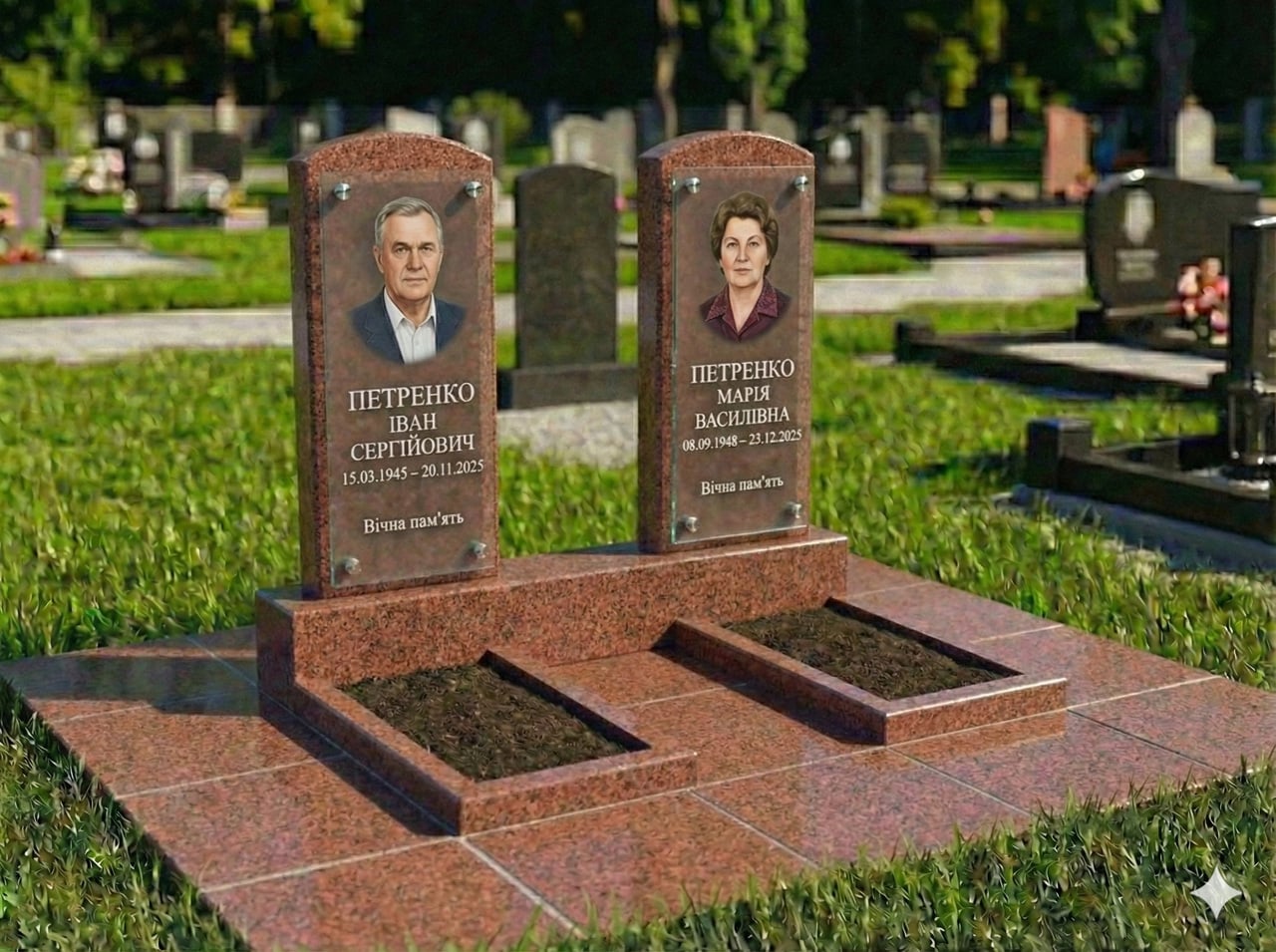 Класичний подвійний пам'ятник із квітником і майданчиком. Пам'ятник може бути виготовлений із чорного, червоного, сірого або зеленого граніту, а також зі світлого піщаника. Розмір майданчика 260*200 см. Додатково може комплектуватися надгробними плитами. Можна зробити розмір майданчика іншою, також можливо змінити форму стелі з урахуванням ваших побажань.