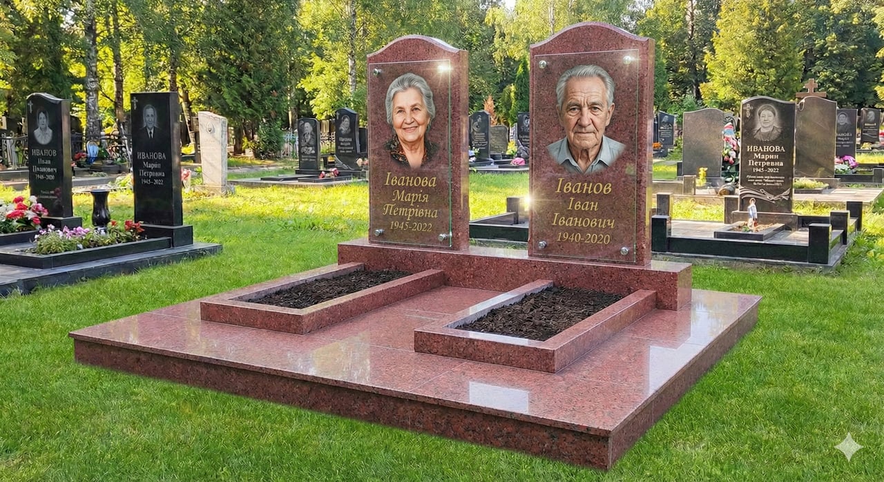 Класичний подвійний пам'ятник із квітником і майданчиком. Пам'ятник може бути виготовлений із чорного, червоного, сірого або зеленого граніту, а також зі світлого піщаника. Розмір майданчика 260*200 см. Додатково може комплектуватися надгробними плитами. Можна зробити розмір майданчика іншою, також можливо змінити форму стелі з урахуванням ваших побажань.