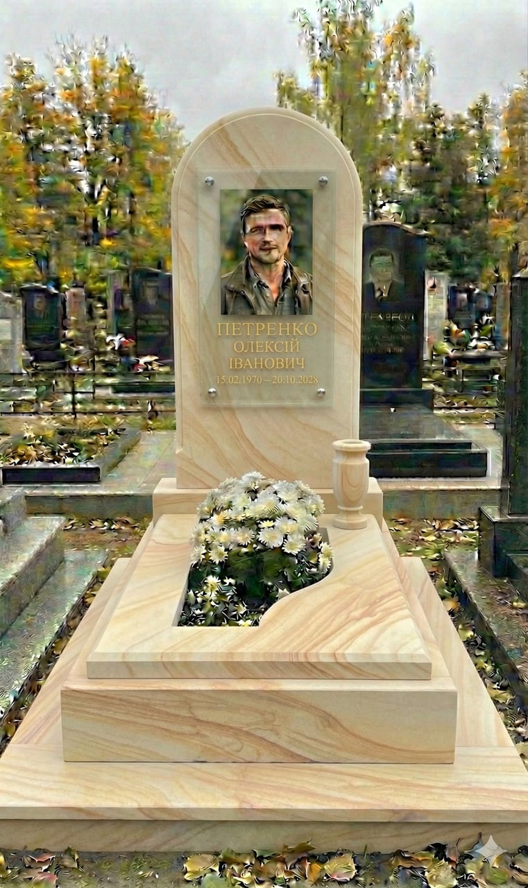 Розмір пам'ятника 200*110 см. Висота 150 см. Розмір стели 120*60*8. Стела може бути виготовлена в різних варіантах. Пам'ятник виготовлений із натурального каменю пісковику. Колір може бути райдужний, білий або жовтий. Пам'ятник також може бути виготовлений із чорного, червоного, зеленого або сірого граніту. Розмір і дизайн пам'ятника може бути змінений з урахуванням ваших побажань.