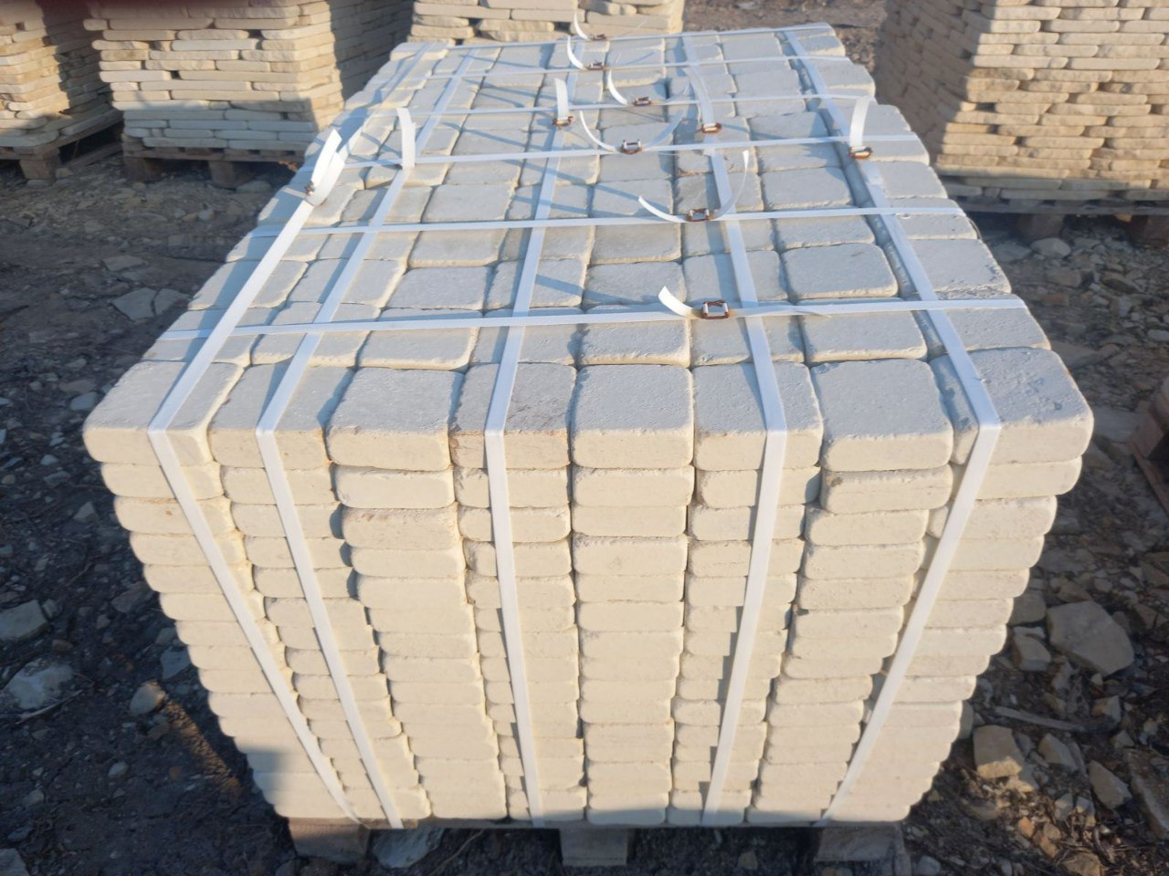 Довжина: 100 мм. Ширина: 100 мм. Товщина: 20 мм. Бруківка пиляно-окатана володіє унікальними естетичними якостями, багатими відтінками колірної гами і малюнком натуральних прожилок. Матеріал: піщаник. Колір: світло-жовтий, жовтий.