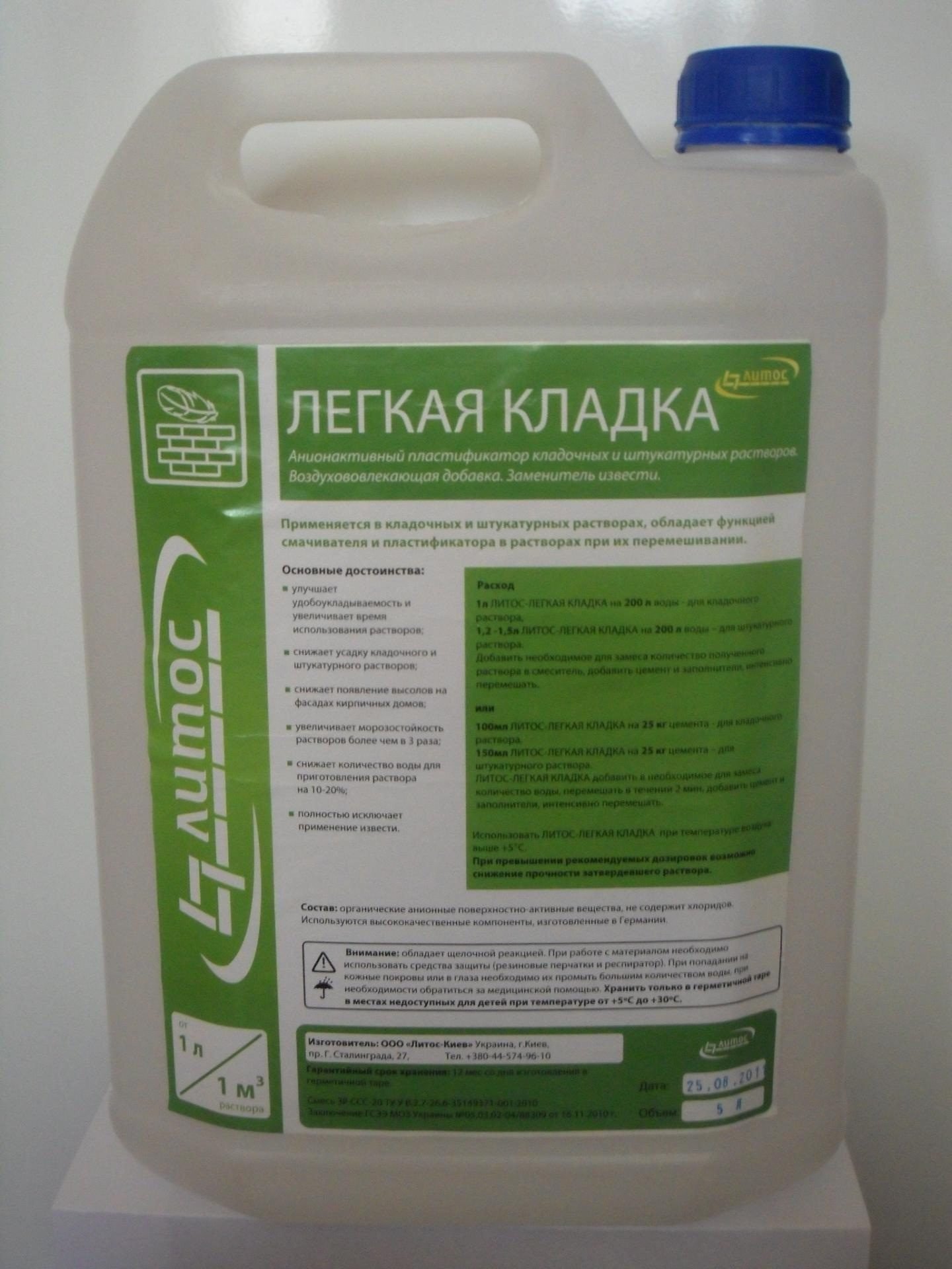 Легка Кладка. Добавка для кладочного розчину "Легка Кладка" – аніонактивної пластифікатор який застосовується для кладок і штукатурних розчинів, замінник вапна, воздуховлекающая добавка. Пластифікатор при додаванні в розчин утворює повітряні пори, знижує усадку і розтріскування швів. Добавка для кладочного розчину "Легка Кладка": - Покращує якість цегляної кладки. - Запобігає висоли на цеглі. - Повністю виключає застосування вапна для приготування розчинів. - Покращує зручність при укладанні розчинів. - Знижує клейкість розчину до інструментів. - На 10-20% знижує кількість води, що додається для приготування будівельних розчинів. - Збільшує час використання приготованого розчину до 8 годин. - Збільшує морозостійкість розчинів. - Не знижує паропроникність стін. - Покращує пластичні властивості розчину. - Знижує водопроникність швів. - Утворює мікропористу структуру будівельного матеріалу, яка перешкоджає руху води в капілярах. - Сприяє утворенню рівній поверхні затверділих розчинів. Пластифікатор "Легка Кладка" підходить для всіх видів кладок розчинів. Витрата: 1 л на 200 л води для приготування розчину; 1,2 – 1,5 л на 200 л води для штукатурного розчину. Об'єм: 5 літрів.
