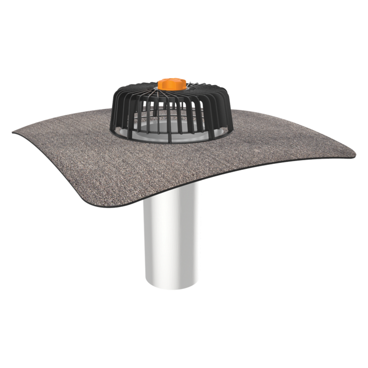 Покрівельна воронка TOPWET із нержавіючої сталі для покрівель без теплоізоляції з привареним фартухом з рулонного бітумно-полімерного матеріалу з листвоуловителем. Воронка може бути вставлена в існуючу трубу, але це може скоротити її пропускну здатність. Довжина 400 мм, можливе замовлення воронок з труби висотою до 600 мм
