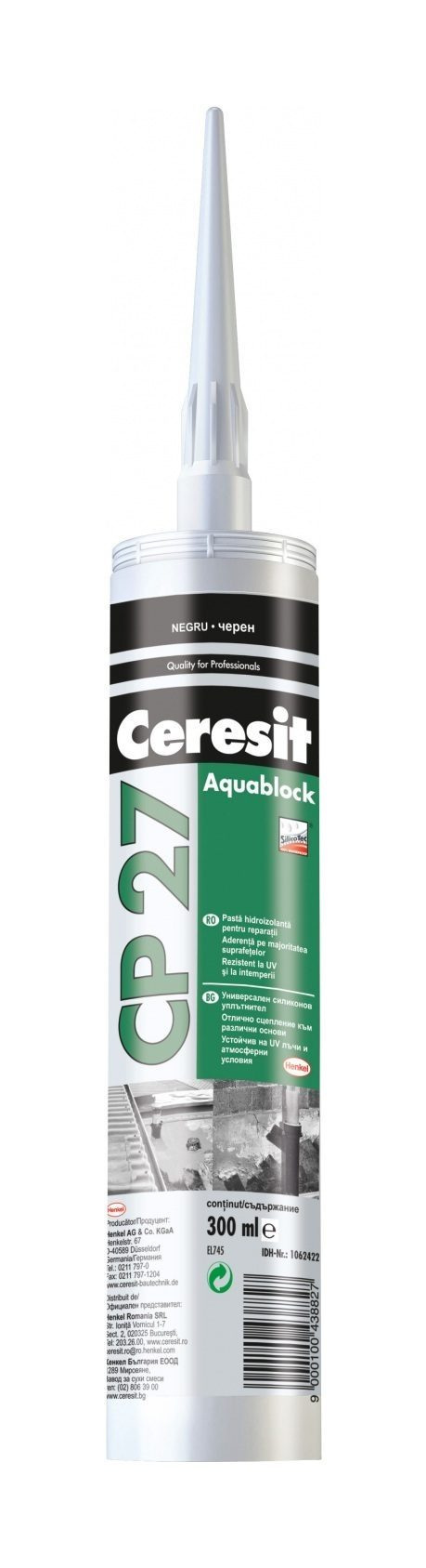 Фасовка: 300 г. Призначення: для окон, для фасада, для кровли, для плитки, для дверей. Силіконовий герметик Ceresit CP 27 AquaBlock 300 мл характеризується відмінними показниками стійкості до хімічних речовин. Утворює герметичне, водонепроникне з'єднання.