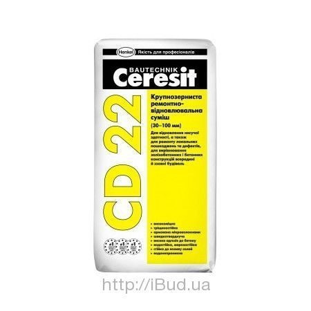 Фасовка: 25 кг. Витрата: 2 кг/м2. Ремонтно-відновлювальна грубозерниста суміш Ceresit CD 22 25 кг відмінно підходить для заповнення різних типів дефектів, які вимагають дуже швидкого ремонту. Консистенція: суха. Розріджувач: вода. Температура застосування: 5...30 °C. Термін придатності: 12 місяць.