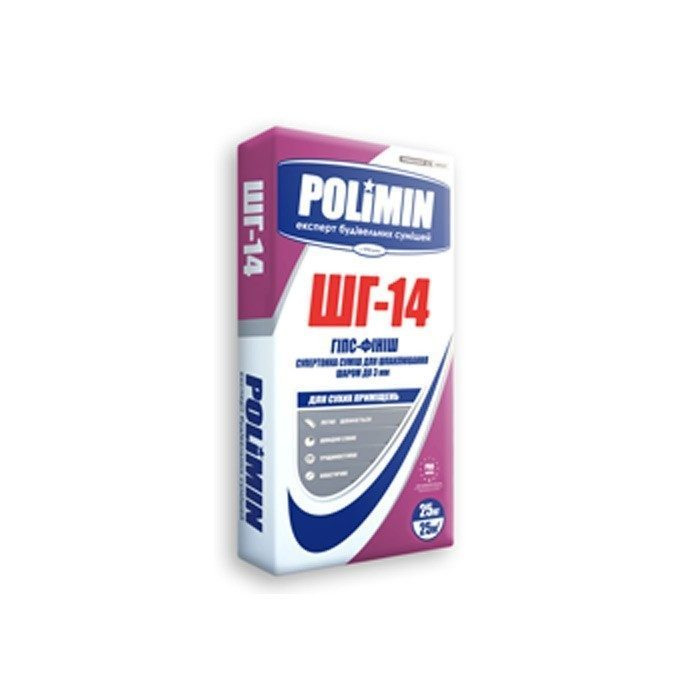 Характеристики товару Супертонка суміш для шпаклювання Polimin Гіпс-фініш ШГ-14 25 кг