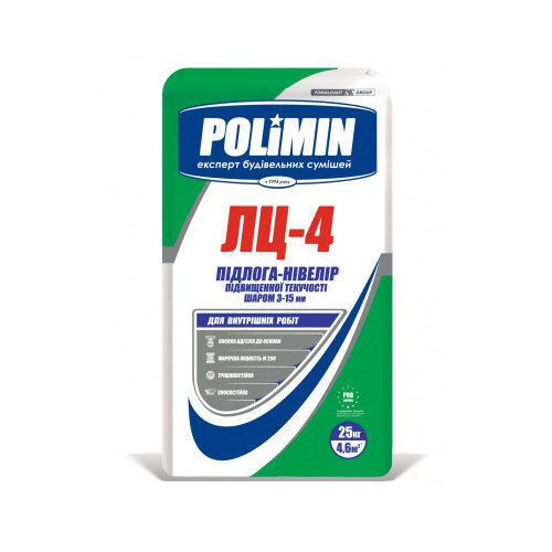 Фасовка: 25 кг. Витрата: 1.8 кг/м2. Підлога самовирівнююча підвищеної текучості Polimin Нівелір ЛЦ-4 25 кг використовується всередині житлових і цивільних приміщень. Термін зберігання: 12 місяць. Спосіб нанесення: ручний. Міцність на стиск, через 28 діб: 5...20 МПа. Призначення: для внутрішніх робіт. Можливість технологічного переміщення: 36 г. Склад: цементні.