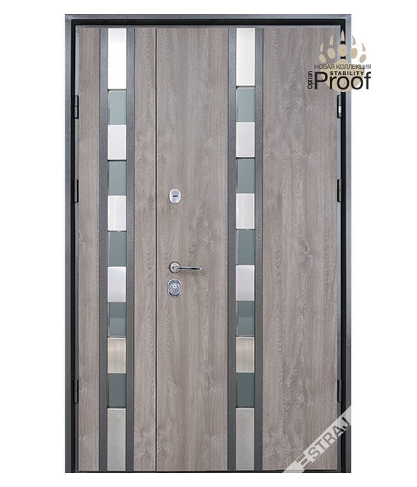 Компания «Страж» - украинское предприятие европейского уровня, которое уже 19 лет занимается изготовлением высококачественных дверей для частных домов и городских квартир. Компания постоянно обновляет модельный ряд, регулярно участвует в специализированных выставках, развивается и повышает качество своих изделий. Компания «Страж» использует только самые современные технологии, качественные материалы, высококлассную фурнитуру, замки от зарекомендовавших себя итальянских и российских производителей, а также авторский декор – кованые элементы и витражное стекло.На сегодняшний день ТМ «Страж» предлагает покупателям широчайший модельный ряд входных дверей – от бюджетных изделий – до серий премиум-класса. Входные двери «Страж» - это оптимальное соотношение цены и качества, индивидуальный подход к каждому клиенту и высочайший уровень сервиса.Компания «Страж» представляет новую коллекцию входных уличных дверей Stability PROOF. Особенностью конструкции является специализированный стальной лист с покрытием ПВХ "Винорит", который изготовлен на основе оцинкованного плоского проката, толщиной 1,2 мм., при толщине покрытия цинка 230 г./кв.м. Ламинированый стальной лист изготавливается компанией Страж методом кашированния на автоматизированной производственной линии европейского производства. Процесс происходит под воздействием давления, температуры и термохимический реакции. В результате покрытие обладает высокими эксплуатационными свойствами.Входные двери Stability PROOF устойчивы к перепадам температур, агрессивным климатическим воздействиям и ультрафиолетовым лучам. В конструкции дверного полотна предусмотрен термомост, что препятствует появлению конденсата, при разнице температур. Надежная входная дверь Stability PROOF станет гарантом безопасности вашего дома.