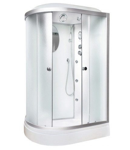 Характеристики та комплектація: Розміри (ШхДхВ): 120*80*215 cm. Матеріал профілю - алюміній Колір профілю - сатин Матеріал вітража - скло гартоване (5 мм) Колір вітража - матовий Задні стінки - скло гартоване, біле Піддон - низький (15 см), правобічний Сифон - є Електронна система управління - є Підсвічування - є, верхня Гідромасаж - 6 форсунок ( розбірні) Масаж ніг - немає Змішувач - є Знімна душова лійка - є Верхній душ - є Поличка - є Сидіння - немає Дзеркало - є Радіо - є Вентилятор - в комплекті є Ролики Ручки в комплекті