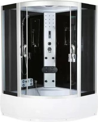 Характеристики та комплектація: Розміри (ШхДхВ): 120*120*220 см Профіль - сатин Матеріал вітража - скло гартоване (товщина - 5мм) Колір вітража - сірий Піддон - висота 42 см Задня стінка - скляна, чорна (товщина 6 мм) Гідромасажні форсунки - 8 шт. Гідромасажна панель - є, алюмінієва Підсвічування верхня - є, зоряне небо Підсвічування бічна - є Витяжний вентилятор - є Гідромасаж для ніг - є Сидіння - є Поличка - є, скляна Тропічний душ - є Гнучкий шланг з лійкою - є Змішувач - є Панель управління - є Радіо - є Дзеркало - є Тримач рушника - є Дозатор - є Сифон - є