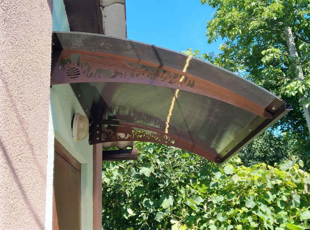 Опис Металевий збірний козирок/навіс над входом Dash'Ok 1,5х1 м Фауна сотовий полікарбонат 6 мм Бронза