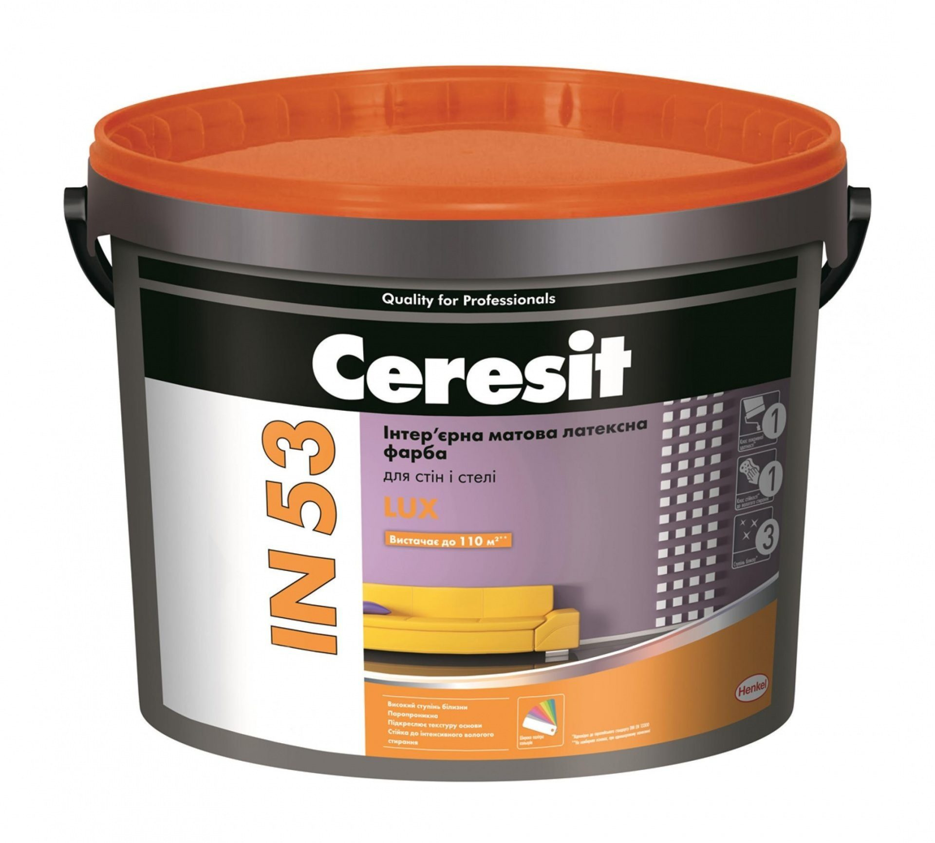 Характеристики товару Інтер'єрна латексна фарба Ceresit IN 53 LUX База А матова 5 л біла