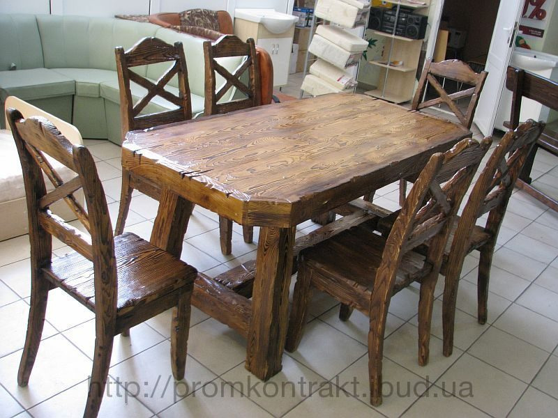 Розміри столу 1710х840х780 мм (ДхШхВ), стільця 1030х400х400х460 мм. Виготовимо будь-які зістарені меблі під Ваші розміри. Меблі з натурального дерева брашовані по волокнах і зістарені штучним способом призначені для використання на дачі, в заміському будинку, лазні, а також в барі, ресторані або пабі. Максимально штучним методом виділена та підкреслена жива природна краса текстури деревини приведе Вас та Ваших гостей у захват від таких меблів. Для таких меблів ідеально підходить глиняний посуд та дерев'яні ложки.