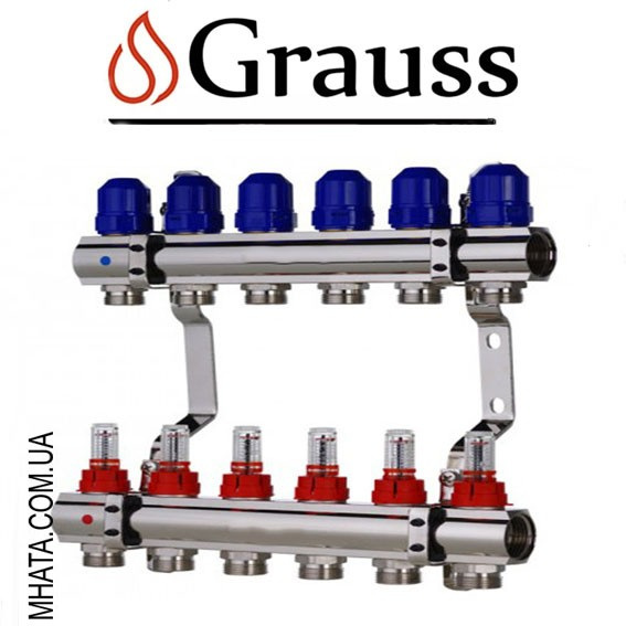 Колектор для теплої підлогитурецької фірми Grauss. Колектор є латунні нікельовані балки. Колектор, що подає (верхній), укомплектований витратомірами напору теплоносія, для зручного та наочного балансування контурів теплої підлоги. Всі витратоміри виконані в розбірному вигляді, що дає можливість легко зробити профілактичні роботи.
