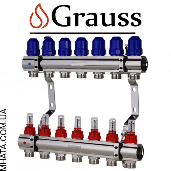 Колектор для теплої підлогитурецької фірми Grauss. Колектор є латунні нікельовані балки. Колектор, що подає (верхній), укомплектований витратомірами напору теплоносія, для зручного та наочного балансування контурів теплої підлоги. Всі витратоміри виконані в розбірному вигляді, що дає можливість легко зробити профілактичні роботи.