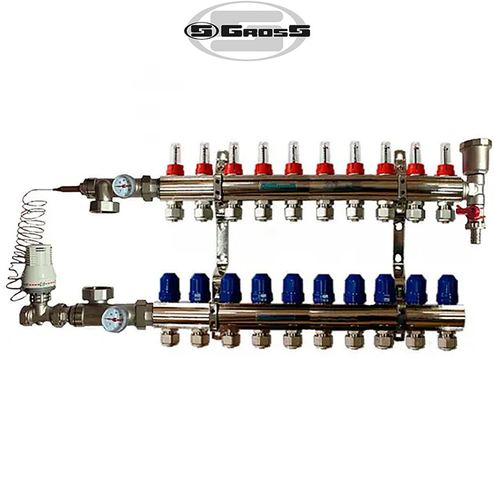 Розподільний колекторний вузол GROSS використовують для регулювання подачі теплоносія в системах та підлогового опалення. Трубопровід кожного з контурів радіаторного або опалення підлоги підключають до окремої пари приєднувальних штуцерів розподільника, що дає можливість регулювати витрату теплоносія, а, відповідно, і теплову потужність системи в кожному приміщенні будівлі індивідуально.