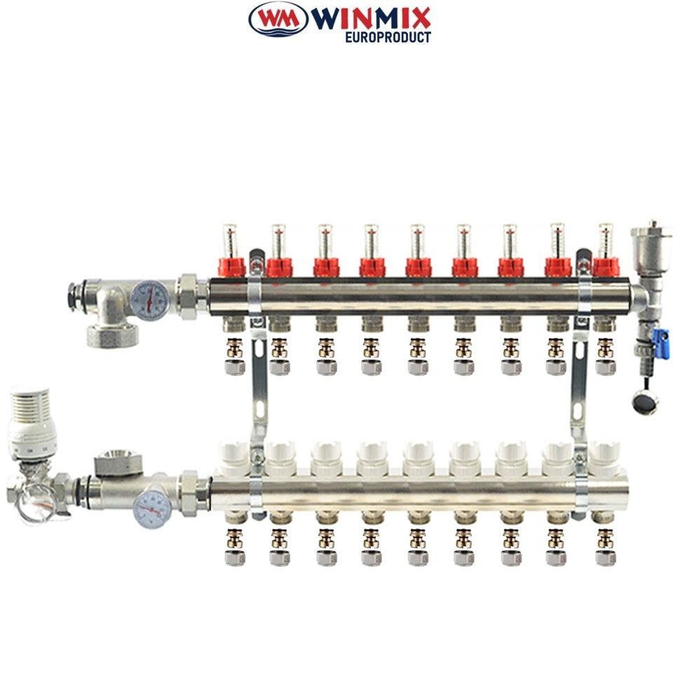 Колекторний вузол у зборі Winmix EUROPRODUCT для системи "ТЕПЛА ПІДЛОГА" з витратомірами, коннекторною групою, зливною групою, краном з термоголовкою 9 виходів.