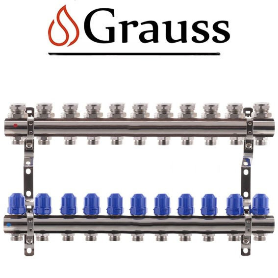 Колектор для теплої підлогитурецької фірми Grauss. Колектор є латунні нікельовані балки. Колектор, що подає (верхній), укомплектований витратомірами напору теплоносія, для зручного та наочного балансування контурів теплої підлоги. Всі витратоміри виконані в розбірному вигляді, що дає можливість легко зробити профілактичні роботи.