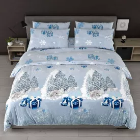Постельное белье Кот Муркот Полуторный Новогодний Голубой с елками и синими подарочными коробками (VD_Казкова_Зима_П)