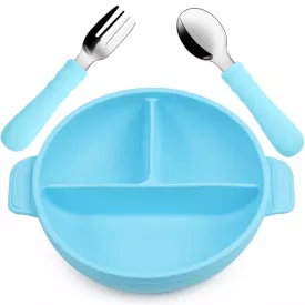 Набір силіконова тарілка килимок, слинявчик ПВХ Блакитний та Силіконова ергономічна ложка (vol-1097)